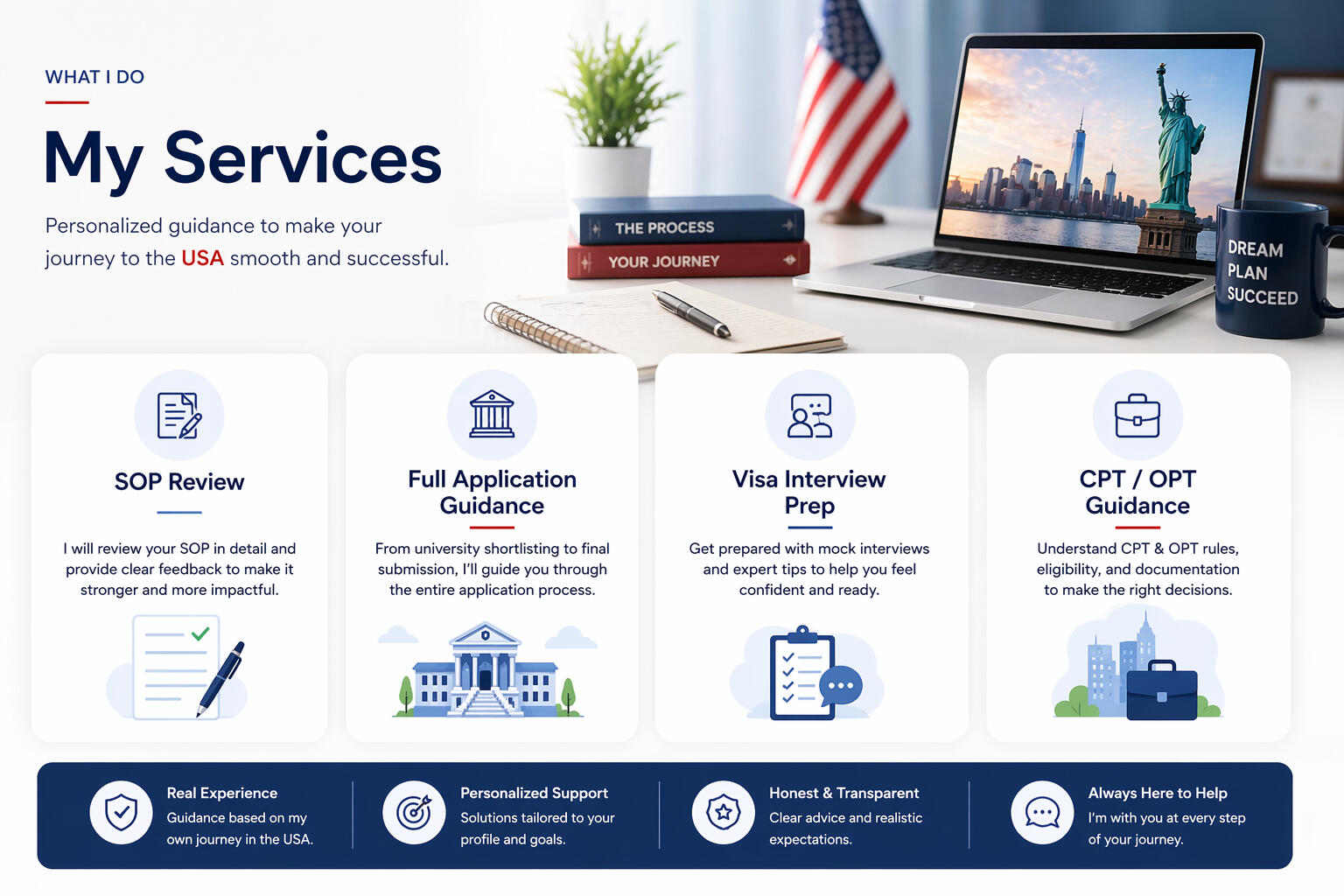 I provide clear, step-by-step guidance to help you apply to US universities with confidence. From SOP writing to visa preparation, everything is based on real experience.