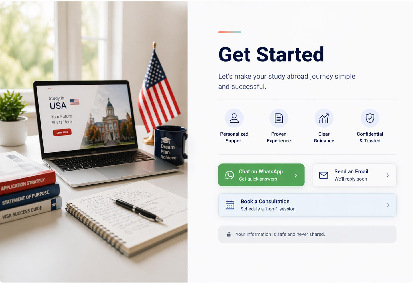I provide clear, step-by-step guidance to help you apply to US universities with confidence. From SOP writing to visa preparation, everything is based on real experience.